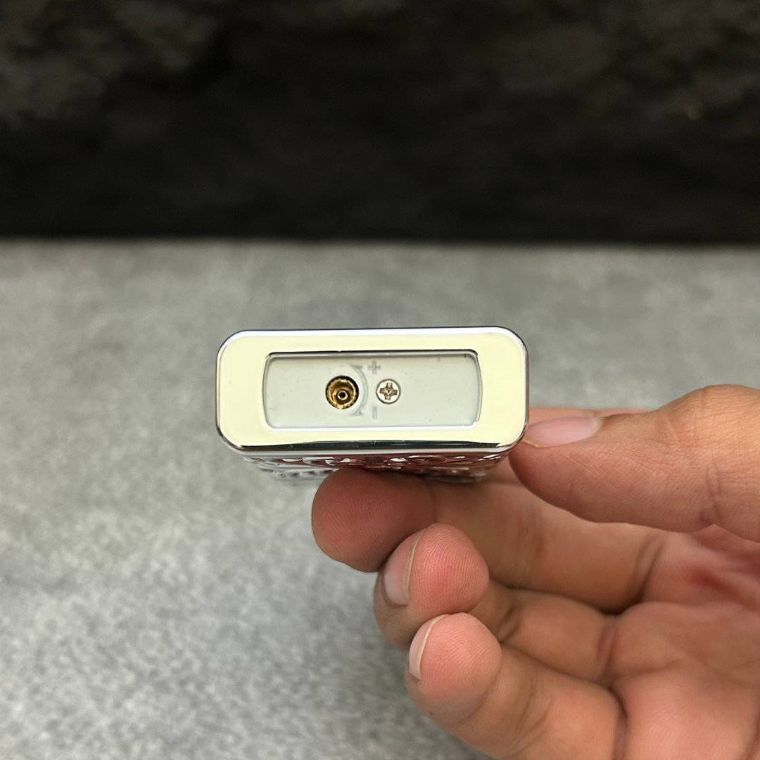 Elegant jet lighter with intricate engraved floral design. Features a strong windproof blue flame and a premium metallic finish, making it perfect for personal use or as a luxury gift item.